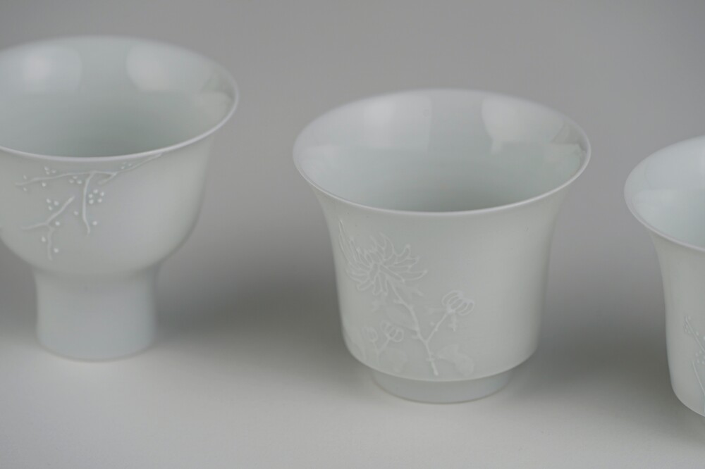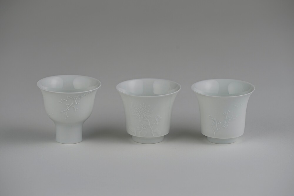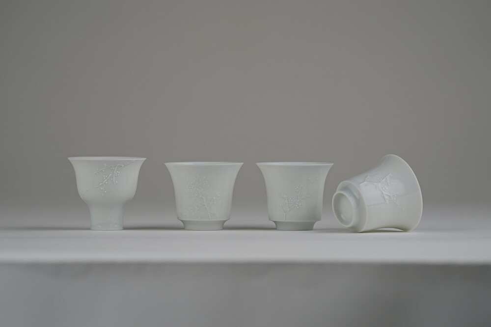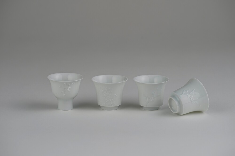 *아래 사진 속 잔들 중 매화가 양각 된 잔을 보내드립니다. 매화는 매번 문양이 조금씩 달라집니다.