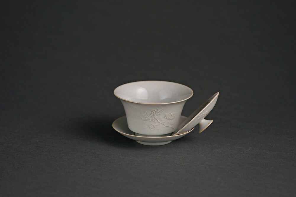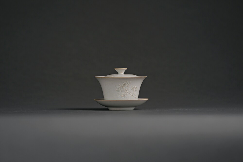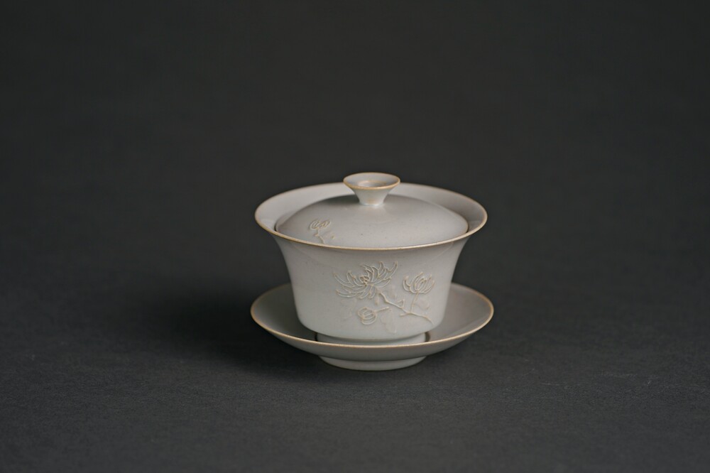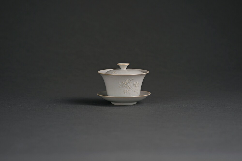 "국화를 흙 물로 한 겹 한 겹 쌓아 올리며 그려낸 양각문양입니다. 은은한 국화를 감상하며 차를 마시기 좋아요.