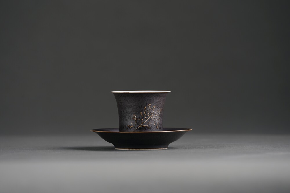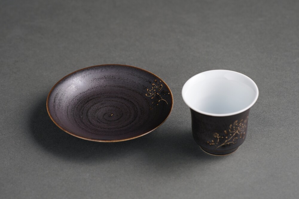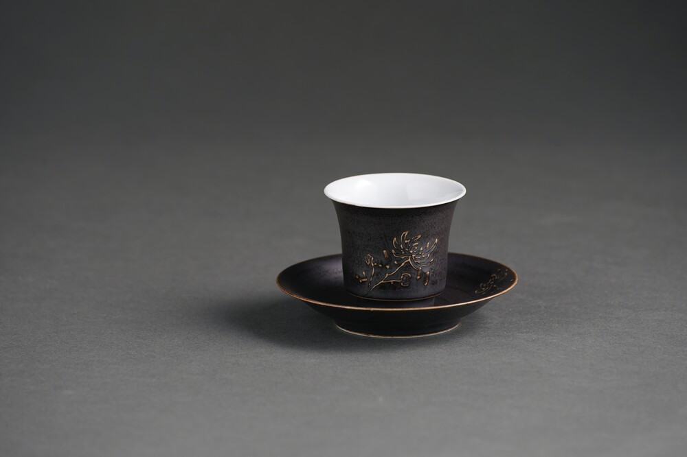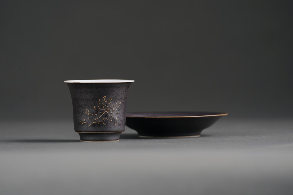 흑유 국화양각 개완잔과 잔받침