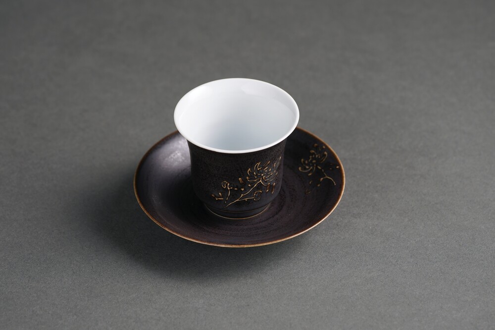 흑유 국화양각 개완잔 + 흑유 국화양각 잔받침